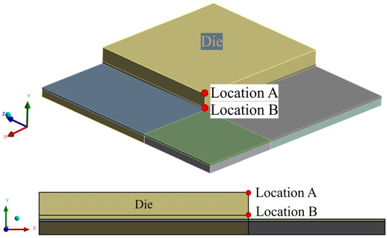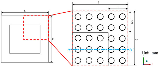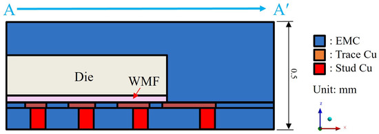 As shown in Figure 11 and Figure 12, a quarter single-package model was established to simulate the representative structure of a typical FOPLP. Figure 11 illustrates the top view of the model, with the dashed line A–A′ indicating the cross-sectional location depicted in Figure 12. The model consists of an EMC, silicon die, WMF, copper trace layer, and copper stud layer. In particular, the copper trace layer includes both copper wiring and the surrounding EMC. Due to the complex geometry and fine features of the copper wiring, direct modeling is computationally expensive. To reduce meshing complexity and simulation time, the rule of mixtures was adopted to calculate the equivalent material properties of the trace layer based on the copper volume fraction. In this study, the copper coverage of the equivalent trace layer was set to 59%.