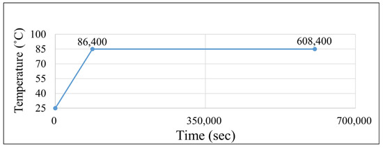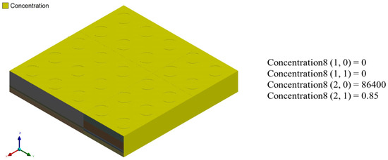 To more accurately replicate the gradual moisture absorption that occurs at the surface in a humid environment, the boundary condition was defined such that the moisture concentration on the exposed surfaces increased from 0% RH to 85% RH over a 24-h period. The detailed humidity boundary conditions are illustrated in Figure 14 and Figure 15.