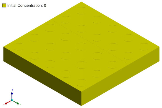 Regarding the humidity boundary conditions, two main settings were applied. First, the initial moisture concentration within the entire package was set to zero, simulating a dry state after the baking process. Second, the surfaces of the package exposed to the external environment were set to 85% RH to mimic real-world conditions.