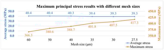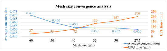 Different mesh models were established for the single-package model to observe the moisture concentration and maximum principal stress results. Table 2 shows the number of elements for each mesh configuration, and Figure 16 presents the moisture concentration results corresponding to different mesh sizes. In Figure 16, the blue line represents the average moisture concentration of the entire package, while the orange line indicates the total simulation time. It can be observed that when the mesh size is between 35 μm and 27.5 μm, the moisture diffusion results begin to stabilize, with minimal variation in average concentration despite finer meshing. Therefore, a mesh size of 35 μm was selected for subsequent simulations as a balance between accuracy and computational efficiency.