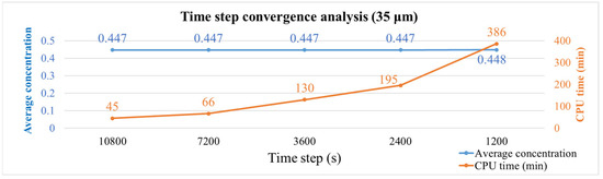 In addition to mesh refinement, a time step convergence study was also conducted since the simulation involves transient structural analysis. As shown in Figure 17, overly large time steps may lead to significant numerical errors at each step, whereas excessively small time steps substantially increase computation time. The plot in Figure 17 compares the evolution of average moisture concentration under different time step sizes. The results indicate that the average concentration remains consistent across various settings, while larger time steps offer a clear advantage in reducing simulation time. Based on these results, a time step of 10,800 s was selected in combination with the 35 μm mesh for all subsequent coupled moisture–thermal analyses.