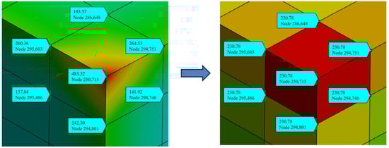 Additionally, maximum principal stress was used to observe convergence results. Figure 18 shows the maximum principal stress for different mesh sizes, with the two curves representing the average stress of the package (blue) and the maximum stress value (orange). It was observed that as the mesh size decreases, the average stress value approaches stability, while the maximum stress value increases with smaller mesh sizes. The maximum stress values are concentrated at the corners of the die. To reduce the effects of stress concentration, the average value of all nodes within an element (element mean) was used for interpreting stress results in subsequent simulations, as illustrated in Figure 19.