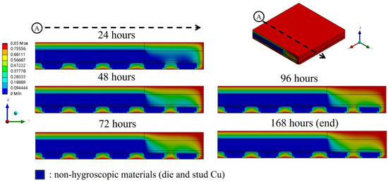 Figure 20 shows moisture diffusion results at MSL 1. The blue areas represent zero moisture concentration and non-hygroscopic materials, while the red areas represent the results of complete saturation under 85% RH environmental humidity. Moisture mainly diffuses from the surface of the EMC material inward, with the entire package stabilizing after approximately 96 h. Moisture diffused more slowly in the thicker EMC because of the distance of exposure to the environment and the lower diffusivity of the material.
