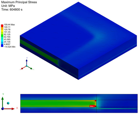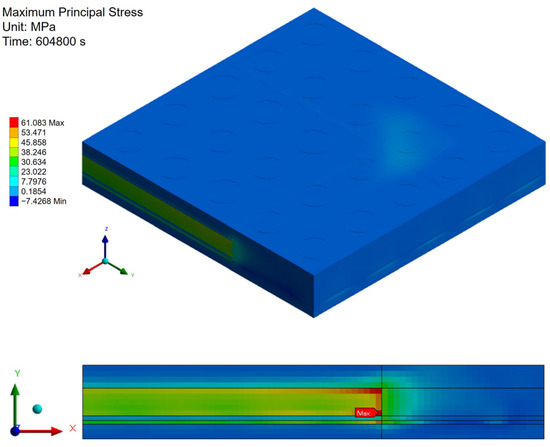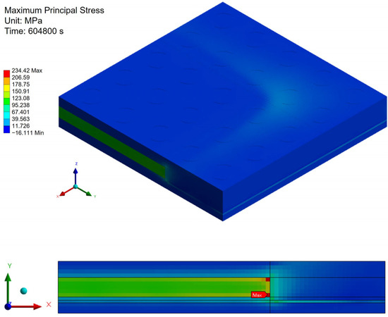 Figure 21, Figure 22 and Figure 23 present the distribution of maximum principal stress at 168 h under three separate loading conditions: temperature only, humidity only, and combined hygrothermal loading. When considering only humidity, the maximum principal stress reaches 61 MPa. Under combined hygrothermal loading, the maximum principal stress increases significantly to 234.4 MPa and is located at the corner of the die. These results confirm that thermal strain contributes the most to stress generation, while moisture effects further amplify the stress distribution.
