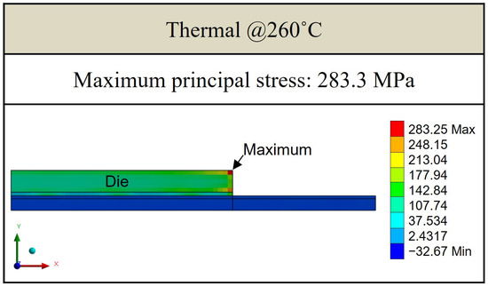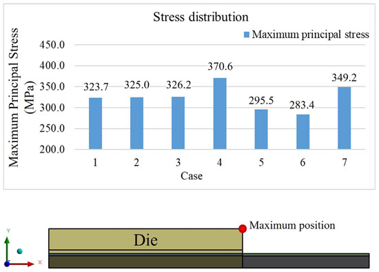 According to the stress results from the seven different models, the maximum stress values are located at the die’s corner, as shown in Figure 29 and Figure 30. From cases 1, 2, and 3, it is observed that adjusting the thickness of the WMF material has a minimal influence on the maximum stress value. Comparing cases 1, 5, and 6 reveals that reducing the EMC thickness and increasing the die thickness help to lower the maximum stress value.