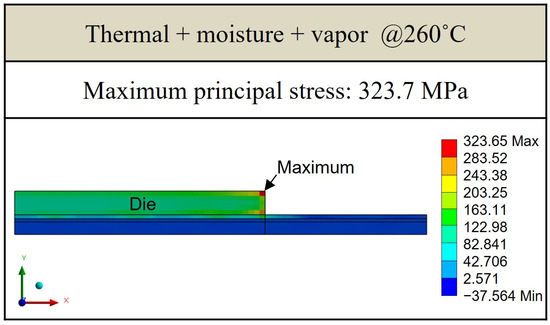Principal stress distribution induced by thermal–moisture–vapor effects under reflow conditions.