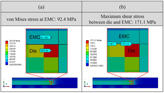Maximum stress distribution of (a) von-Mises stress and (b) maximum shear stress between die and EMC.