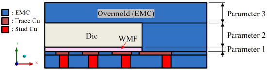 To evaluate the impact of structural configuration on stress development in FOPLP, this study conducted a sensitivity analysis by varying the thickness of three key components—the overmold (EMC), die, and WMF—as illustrated in Figure 28. Seven geometric models with different layer thicknesses were established to investigate how these variations influence stress distribution during reflow. The specific structural parameters used in the sensitivity analysis are summarized in Table 3.