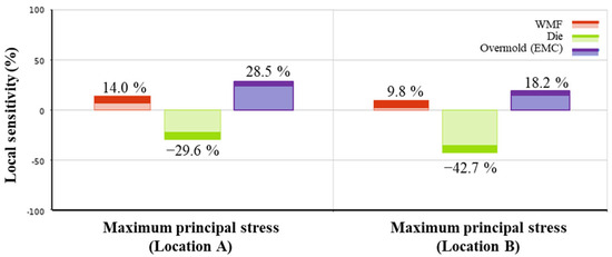 Additionally, a local sensitivity analysis was conducted using the response surface constructed from the seven individual design cases, focusing on Locations A and B as shown in Figure 31. The local sensitivity values were calculated using the Response Surface Method module in ANSYS Workbench 2023 R1. These values indicate the relative impact of each structural parameter, specifically the thicknesses of the overmold, die, and WMF, on the maximum principal stress.
