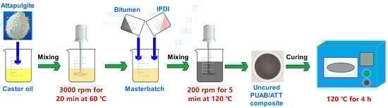 Based on our previous studies [25,43], the molar ratio of IPDI to CO was maintained at 1:1.2. The bitumen content in bio-based PUAB was 60 wt%. The ATT content in the composites was varied at 0.5, 1, and 2 wt%.