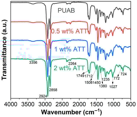 FTIR spectra of cured bio-based PUAB and PUAB/ATT composites.