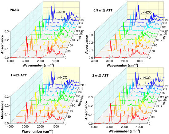 Figure 5 displays FTIR spectra tracking curing progression for bio-based PUAB and its ATT composites. The continuous decrease in intensity of the –NCO stretching band at 2264 cm−1 confirms ongoing polyaddition between isocyanates and polyols [53]. After 4 h of curing, a low-intensity –NCO band remains detectable, indicating incomplete reaction.