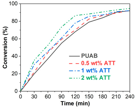 Conversion as a function of time for bio-based PUAB and PUAB/ATT composites at 120 °C.