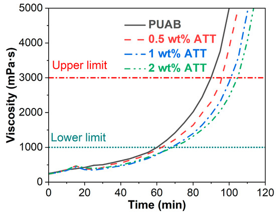 Rotational viscosity over time for bio-based PUAB and PUAB/ATT composites at 120 °C.