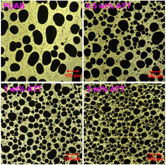 Table 7 summarizes the average diameters and dispersity (Ɖ, defined as the ratio of Dw to Dn) of bitumen particles in cured bio-based PUAB and its ATT composites. The results demonstrate that ATT incorporation significantly reduces the average particle diameters in bio-based PUAB. Furthermore, the average diameter of bitumen particles in ATT composites shows a decreasing trend with increasing clay loading. Specifically, with 2 wt% ATT addition, the Dn and Dw values decrease from 41.4 to 15.8 µm and from 50.7 to 21.6 µm, respectively. ATT incorporation also increases the dispersity of bio-based PUAB, suggesting a more heterogeneous distribution of bitumen particles in the composites compared to neat PUAB. Notably, the dispersity of ATT composites displays a nonlinear dependence on clay content.