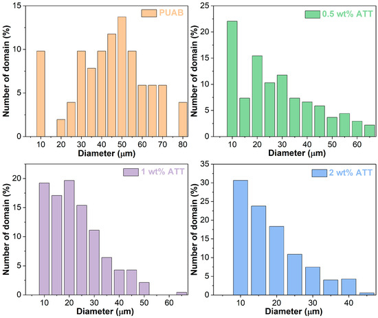 Particle size distribution of bitumen domains in bio-based PUAB and PUAB/ATT composites.