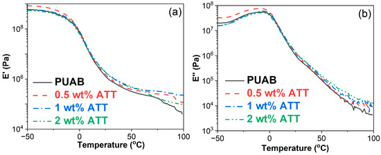 Storage modulus (a) and loss modulus versus temperature (b) of bio-based PUAB and PUAB/ATT composites.