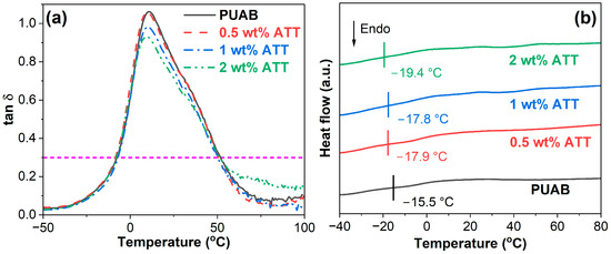 Damping factor–temperature (a) and DSC curves (b) of bio-based PUAB and PUAB/ATT composites.