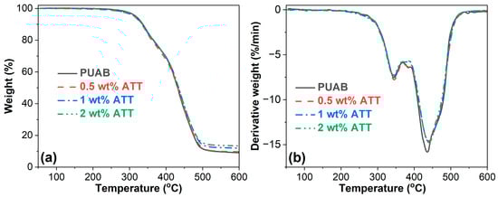 Pristine ATT shows two distinct decomposition peaks at 74.5 °C (T1dmax) and 119.4 °C (T2dmax), attributed to physically adsorbed water molecules, zeolitic water, and hygroscopic water. These peaks, along with the T3dmax peak from hydroxyl groups, disappear in the composite DTG curves due to the polyaddition reaction between isocyanate groups (PU) and hydroxyl groups (ATT). While ATT addition negligibly affects the T1dmax of neat PUAB, it causes a slight elevation in T2dmax. The relationship between ATT loading and decomposition temperatures (T1dmax and T2dmax) follows a nonlinear pattern (Table 10).
