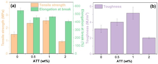 Tensile strength, elongation at break (a), and toughness (b) of bio-based PUAB and PUAB/ATT composites.