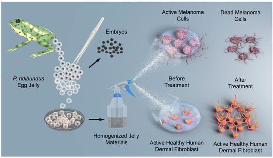 In this study, the previously unexplored chemical composition of P. ridibundus egg jelly, which protects and nourishes embryos under variable environmental conditions, was elucidated through physicochemical analyses, including FT-IR, TGA, XRD, elemental analysis, and SEM. The carbohydrate and protein contents, along with the monosaccharide composition and protein profile of the egg jelly—hypothesized to exhibit glycoprotein characteristics—were analyzed. The effects of the characterized egg jelly structure on melanoma cancer cells were investigated, and its potential toxicity to healthy human dermal fibroblasts was tested. Additionally, for the first time, the xCELLigence system, which enables real-time monitoring, was utilized to assess cancerous and healthy skin cells and to determine the effective dose for skin cancer treatment. The study is schematized in Figure 1.