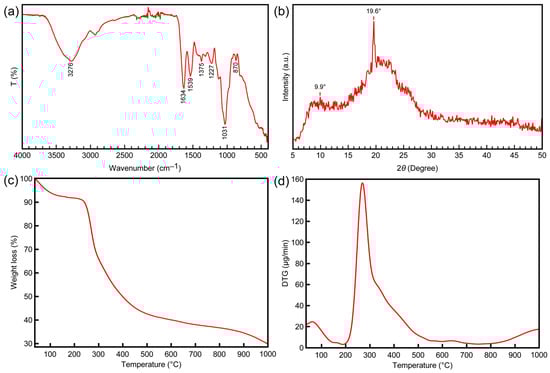 Characterization results of the egg gel sample: (a) FT-IR spectrum, (b) XRD pattern, (c) TGA curve, and (d) DTG curve.