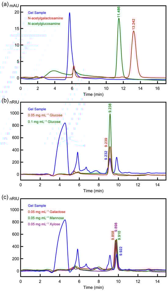 The chromatogram showed the presence of glucose, galactose, mannose, and xylose sugars. These findings align with previously reported sugars in amphibian egg jelly [,,]. Additionally, the free glucose content was determined to be 0.28 ± 0.01 mg mL−1. The inability to distinguish galactose, mannose, and xylose separately is attributed to the overlapping retention times of these sugars, as evident from Figure 4c. Literature data confirm the presence of these sugars, and the overlapping retention times of the sample support these findings [,,].
