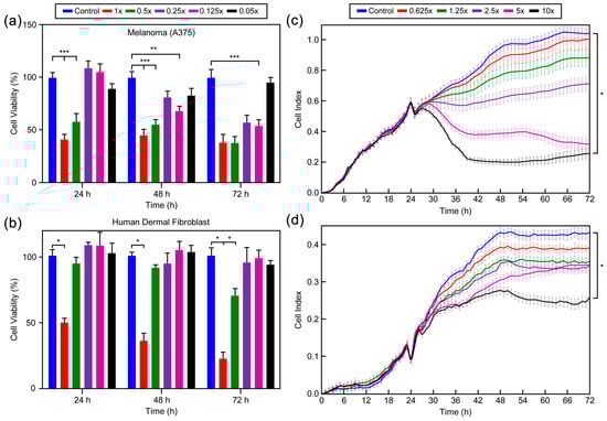 Cell viability (%) results of the MTT assay: (a) Melanoma (A375) cells (** p < 0.01; *** p < 0.001; n = 3) and (b) Human dermal fibroblasts (* p < 0.05; n = 3). Cell index measurements from xCELLigence analysis: (c) Melanoma (A375) cells (* p < 0.05; n = 3) and (d) Human dermal fibroblasts (* p < 0.05; n = 3) (control group refers to wells containing medium only, without gel).