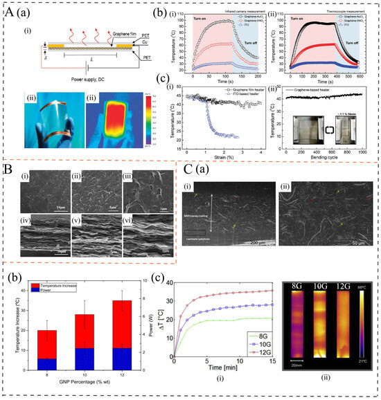 (A): (a) A schematic structure (i), an optical picture (ii), and infrared picture (iii) of a transparent, flexible graphene heater film [6]. (b) The temperature profiles of graphene-based heaters with two different doping agents and an ITO-based heater, measured by (i) an infrared scanner and (ii) a thermocouple (K-type) [6]. (c) Mechanical stability of the graphene-based heater including (i) variations in the temperature of a graphene-based heater compared with an ITO-based heater as a function of bending strain and (ii) mechanical stability test results of the graphene-based heater [6]. (B): The surface (i–iii) and cross-sectional (iv–vi) SEM images of the electrothermal films in different magnifications [36]. (C): (a) SEM images of epoxy coating doped with 10 wt% GNP over a laminate substrate, where (i) shows a lateral cross-section and (ii) shows the surface morphology [12]. (b) Electrical power and the maximum increase in temperature reached by the application of 800 V at room temperature [12]. (c) (i) Increase in temperature as a function of time and (ii) thermal images for increasing GNP wt.%, specifically 8 wt.% (8G), 10 wt.% (10G), and 12 wt.% (12G) [12].