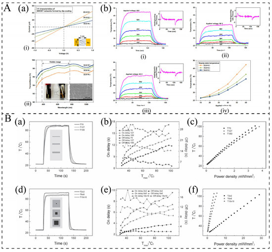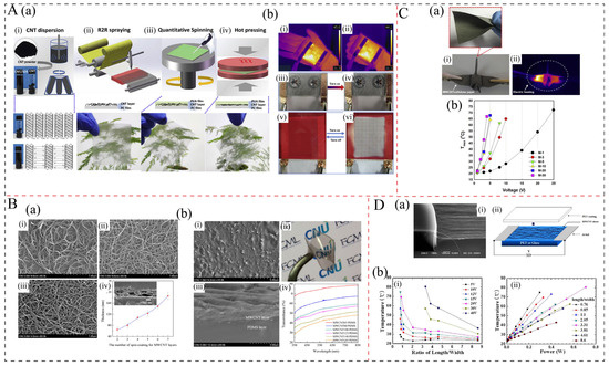 (A): (a) Schematic illustrations of the self-developed fabrication process for PVA/CNTs film: (i) Schematic diagram of CNTs dispersion and corresponding optical image; (ii) Spraying method for pre-constructing CNT network on polycarbonate surface; (iii) quantitative spinning process to introduce ultrathin PVA layer; (iv) hot pressing treatment to prepare PVA/CNTs film [42]. (b) (i,ii) Thermal images of PVA/CNTs heater affixed on hand in different states; (iii,iv) the defrosting result of PVA/CNTs heater before and after the heating process; (v, vi) reversible thermochromism is also observed in a dyed film. [42]. (B): (a) (i–iii) SEM images of MWCNT layers prepared by different cycle numbers (2, 4, and 6) of spin-coating on glass plates; (iv) change of average thickness of MWCNT layers as a function of the cycle number of spin-coating and a typical SEM image of cross-section of MWCNT layer formed by 7 cycles of spin-coating on a glass plate [41]. (b) SEM images of surface (i) and cross-section (ii) of MWCNT108/PDMS bilayer film with 108 nm thickness of the MWCNT layers; (iii) optical image of MWCNT108/PDMS bilayer film; (iv) transmittance of MWCNT/PDMS bilayer films with different MWCNT layer thicknesses [41]. (C): (a) (i) Typical digital and (ii) infrared images for the paper crane made of M-1 paper under an applied voltage (M-x, where x denotes the cycle number of dip-coating processes) [34]. (b) Changes in steady-state maximum temperature (Tmax) of MWCNT/cellulose papers as a function of the applied voltage [34]. (D): (a) (i) Scanning electron microscopy (SEM) image of MWCNT sheets from well-aligned MWCNTs on a substrate and (ii) the diagram of MWCNT sheet film on a substrate with an electrode pair [76]. (b) (i) Sheet temperatures plotted versus length/width at different DC voltages, and (ii) sheet temperature plotted versus applied DC power to sheet film for each length-to-width ratio [76].