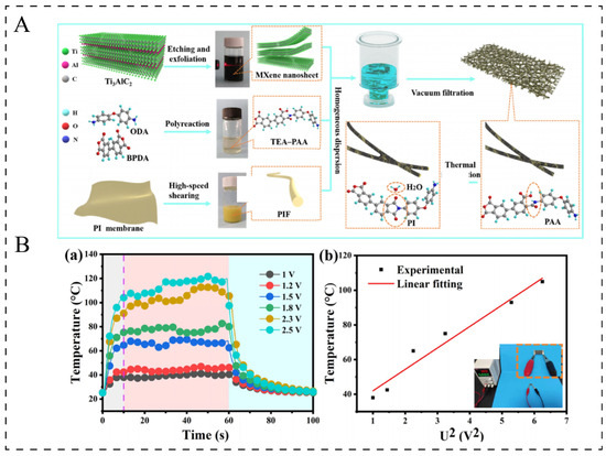 (A): Schematic illustration for the fabrication of flexible conductive PIF/MXene composite films [20]. (B): (a) Time-dependent surface temperature profile of PM-49.1 under different voltages [20]. (b) Experimental data and linear fitting of saturated temperature vs. U2 [20].