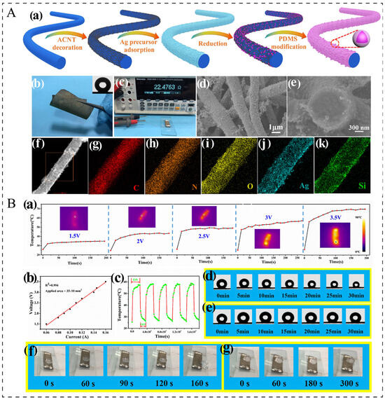 (A): (a)Schematic illustration of the preparation process of superhydrophobic and electrically conductive TPU/ACNT/AgNP/PDMS nanofiber composites [95]. (b) Photograph of the CNC membrane with good flexibility [95]. (c) Photo showing the resistance of one piece of CNC membrane [95]. SEM image for (d) surface and (e) cross-sectional morphology [95]. (f) TEM image of the CNC membrane [95]. (g–k) Element mapping images for C, N, O, Ag, and Si, respectively [95]. (B): (a) Temperature variation of the CNC at different applied voltages. (b) Voltage–current curve of the CNC [95]. (c) Temperature variation of the CNC experiencing cyclic heating–cooling process at a given voltage of 3 V [95]. Water droplet on the CNC surface (d) with a voltage of 3 V and (e) without an applied voltage [95]. De-icing performance of the CNC (f) at a voltage of 3 V and (g) without an applied voltage [95].