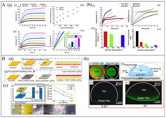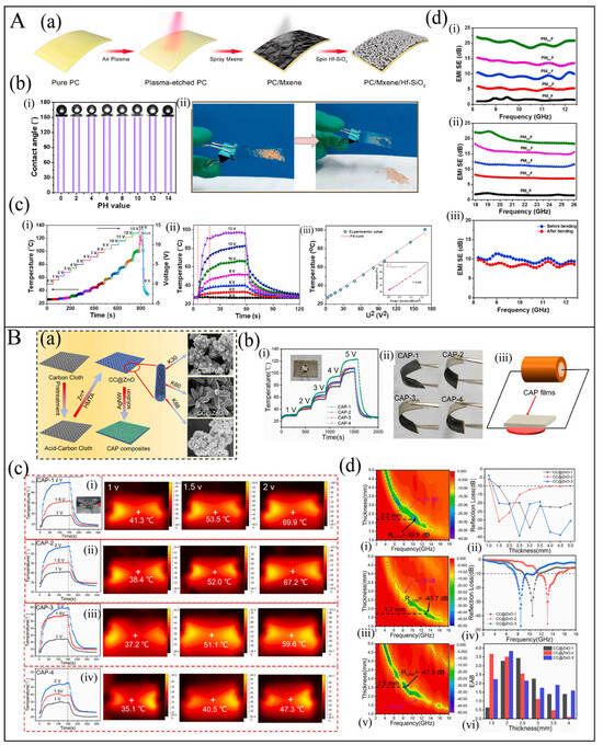 (A): (a) SEM images of the surface of PANF/SCB films with 23 and 28.5 wt.% SCBs at ×3000 (i,ii) and ×20000 (iii,iv) magnification, respectively. The inset shows digital images of PANF/SCB films [24]. (b–g) Electric heating performance of HA-PANF/SCB films with different PANF/SCB mass ratios [24]. (B): (a) (i) Raman spectrogram of GNSs in different layers, (ii) Thermal gravimetric analysis and Differential Thermal Analysis results of 3D intercalation GNS/MWCNT/CB composite, and (iii) schematic diagram of CNTs and CB intercalated in GNS [87]. (b) (i) Electrothermal performance of the flexible electrothermal film under different voltages; (ii) performance of the flexible electrothermal film with continuously changing voltage; (iii, iv) performance and the stability test of the flexible electrothermal film in air [87].