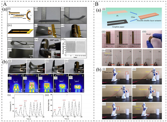 - Wang, Y.; Li, K.; Li, X.; Cui, H.; Liu, G.; Xu, H.; Wu, X.; Yao, W.; Zhong, B. Electro-thermally driven flexible robot arms based on stacking-controlled graphite nanocomposites. Carbon 2019, 152, 873–881. [Google Scholar] [CrossRef]