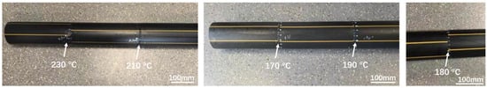 To investigate the ability of the microwave system in identifying cold welding defects in thermal fusion welds of HDPE pipes, HDPE pipes were fused at five different temperatures, namely 170 °C, 180 °C, 190 °C, 210 °C, and 230 °C, producing five thermal fusion welds. The standard temperature range for thermal fusion of HDPE pipe is 210 °C to 230 °C, and temperatures below 210 °C may result in cold welding defects. The microwave resonant probe was positioned at the center of the weld and a 360° circumferential scan was conducted around the pipe, recording the S