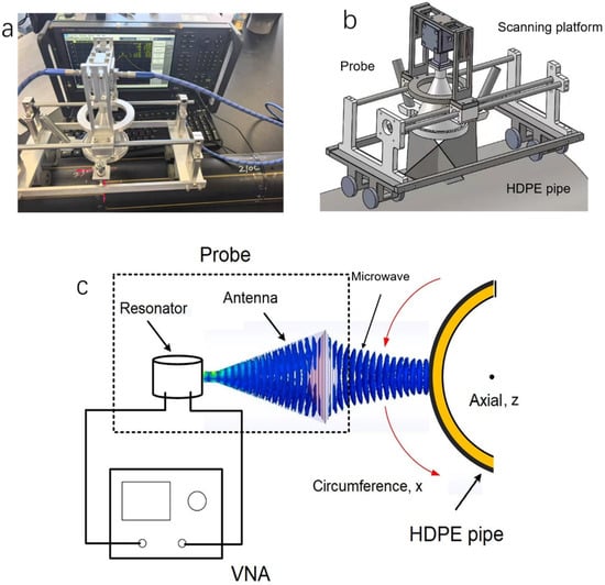 Figure 4. The HDPE pipe was scanned using the microwave resonant probe, with a constant standoff distance between the probe and the pipe surface throughout the entire scanning process. Three resonance curves were recorded, as follows: one when the probe was positioned at a normal (defect-free) location on the pipe, one at the 2 mm hole, and one at the 3 mm hole, as shown in