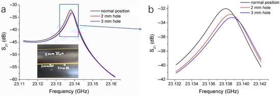 Figure 4a. All resonance peaks were located within the frequency range of 23.135 to 23.140 GHz. Compared with the normal location, the resonance peak at the 2 mm hole exhibited a decrease in magnitude and a slight frequency shift. At the 3 mm hole, the peak magnitude was further reduced, and the peak position shifted towards higher frequencies.