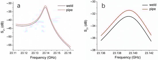 21 magnitude at the resonance peak of the weld being lower, exhibiting a difference of 1.04 dB. This result indicates that the impact of fusion on the structural integrity of HDPE material can be detected by our microwave testing system, further confirming the feasibility of using a microwave resonant probe to assess the thermal fusion welds of HDPE pipes.