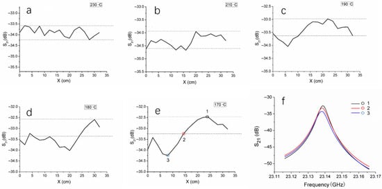 21 magnitude fluctuations of the welds formed at 190 °C, 180 °C, and 170 °C are larger than those at 230 °C and 210 °C, and the fluctuation amplitude increases as the temperature decreases. In each plot, two dashed lines spaced 0.66 dB apart were added, with the upper dashed line positioned at the maximum S