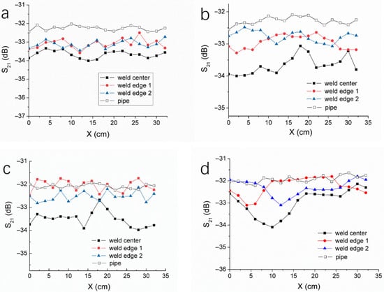 For the welds formed at 190 °C, 180 °C, and 170 °C, the magnitude of S21 at the weld center is also smaller than that at the weld edge and that of the pipe body. Additionally, the fluctuation in the S21 curves at the weld center is significantly greater than those at the weld edges, indicating that the edges of the weld are less affected by lack of fusion. This also suggests that, for better detection of cold welding defects, the probe should be positioned at the weld center and that a circumferential scan should be conducted along the weld seam. Compared with the welds formed at 190 °C and 180 °C, the three S21 curves of the weld formed at 170 °C exhibit a larger variation, further validating the capability of our microwave inspection method for detecting cold welds.