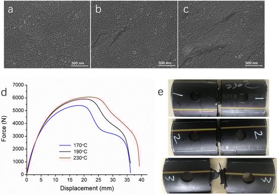 Figure 8a, the microstructure of welds formed at the normal fusion temperature (230 °C) is uniform and dense, with no apparent defects. In contrast, the microstructures of welds formed at 190 °C and 170 °C exhibit grooves and microcracks, with the latter (170 °C) showing more pronounced defects (
