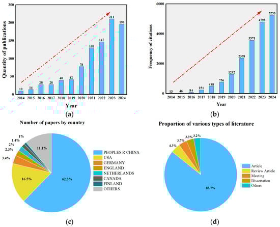 Furthermore, citation analysis using the Graph Maker function of HistCite Pro 2.1 revealed that the publication with the highest Local Citation Score (LCS) was published in 2014. Overall, the majority of highly cited papers (with high LCS values) were concentrated between 2014 and 2022, indicating that these studies have laid a solid theoretical foundation and provided directional guidance for subsequent research. Figure 1c presents the country-wise distribution of the relevant publications. The results show that China and the United States lead significantly in the number of publications in this field, accounting for 62.3% and 16.5%, respectively. This trend highlights the strong research capacity and international influence of the scholars from these two countries in asphalt materials research. In addition, Germany and the United Kingdom, along with other Asian regions (such as Japan and South Korea), have also made important contributions. A further analysis of the document types, as shown in Figure 1d, indicates that research articles constitute the overwhelming majority. This suggests that the application of molecular dynamics simulation in asphalt materials remains in an active phase of exploration and is expected to demonstrate even greater research potential in the future.