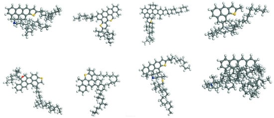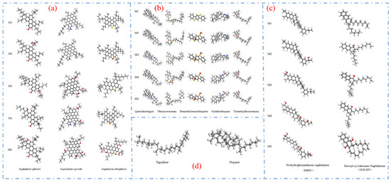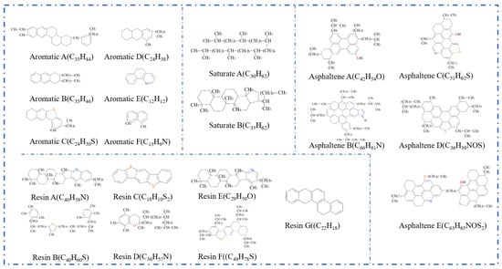 The generic model molecular model of asphalt was developed to simplify the complex chemical nature of asphalt by representing it with a set of typical molecular structures. Essentially, this approach captures the overall average chemical characteristics of asphalt through a limited number of representative molecular configurations. The development of average asphalt models has undergone a lengthy evolution. Among early studies, Jennings et al. [14], based on nuclear magnetic resonance (NMR) spectroscopy, identified the key structural features such as aromaticity, aliphatic chain length, and the presence of nitrogen- and sulfur-containing functional groups. Based on these findings, they proposed eight standardized molecular models of asphalt samples, which laid the foundation for the subsequent research on the asphalt molecular structure. These models were developed within the Strategic Highway Research Program (SHRP). They include AAA-1, AAB-1, AAC-1, AAD-1, AAF-1, AAG-1, AAK-1, and AAM-1. Each model represents an average molecular structure of asphalt. Researchers used these models to study the properties of asphalt in detail. [2,15]. Figure 2 shows these molecular structures. These models encompass asphalts from different sources and with varied performance characteristics, providing a foundational basis for the molecular simulation research on asphalt. With respect to specific molecular characteristics, studies have found that polar aromatics typically exist as black solids at room temperature [16] and possess lower molar masses than asphaltenes, although their molecular compositions are very similar [17]. Building upon these insights, Murgich et al. [18] proposed an average molecular structure model for polar aromatics, offering a valuable reference for investigating the microscopic properties and intermolecular interactions of asphalt. The development of average molecular models has not only established the theoretical basis for constructing asphalt microstructural models but has also introduced a novel approach to studying the relationship between the molecular structure and material performance. These models reveal the distribution characteristics of the key components within asphalt and underscore the necessity of incorporating substitutable atoms, thereby offering a clear direction for the further optimization of asphalt molecular models.