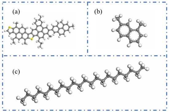 The three-component approach classifies asphalt into three main constituents—oils, resins, and asphaltenes—which serves as the foundation for constructing asphalt molecular models. Groenzin and Mullins [19] were the first to propose a molecular structure for asphaltenes. Building upon this, Zhang and Greenfield [19,20] developed representative molecular models for resins and oils, namely the 1,7-dimethylnaphthalene molecule and the n-C22 (n-docosane) molecule. Based on these studies, Ding et al. [21] constructed a three-component molecular model of asphalt using the aforementioned molecular structures for asphaltenes, resins, and oils. This model provides an intuitive framework for investigating the microscopic behavior of asphalt. The specific configuration of the three-component model is illustrated in Figure 3.