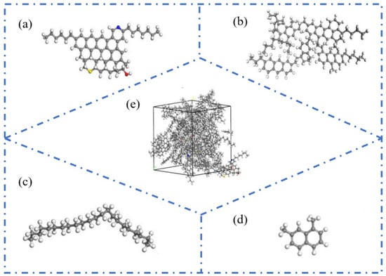 Four-component molecular model of asphalt. (a) Pyrrole; (b) molecules derived from maltene condensation reactions; (c) 1,7-dimethylnaphthalene; (d) n-docosane (n-C22); (e) virgin asphalt [6].