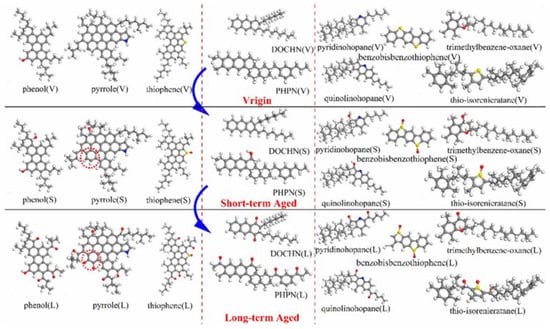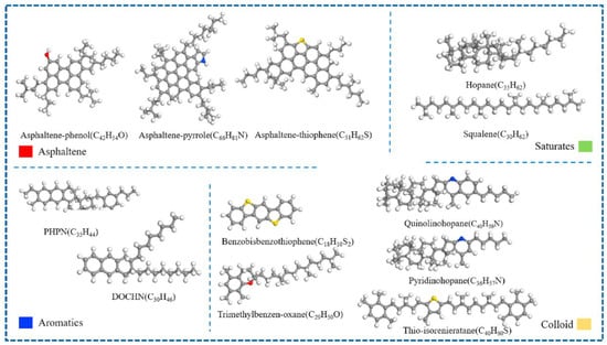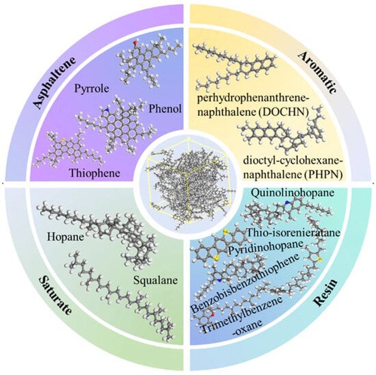 With the deepening understanding of the asphalt molecular composition, researchers have identified certain limitations in the three-component approach when it comes to comprehensively representing asphalt’s molecular structure. Specifically, the study by Rostler et al. [23] indicated that a single average molecular model is insufficient to fully characterize the diverse properties of asphalt. In contrast, the four-component model (aromatics, saturates, resins, and asphaltenes) provides a more refined and detailed depiction of asphalt’s molecular architecture. Based on this theory, Dong [24] and Qi [25] proposed molecular models for asphaltenes and resins. Further, Li et al. [6] successfully constructed a four-component molecular model of base asphalt (as shown in Figure 4), providing critical support for the further exploration of the relationship between asphalt’s molecular structure and its macroscopic performance. The four representative average molecular structures correspond to the key components of asphalt. Specifically, resins, aromatics, saturates, and asphaltene are represented by the molecules derived from maltene condensation reactions [26], 1,7-dimethylnaphthalene, n-docosane (n-C22) [27], and pyrrole.