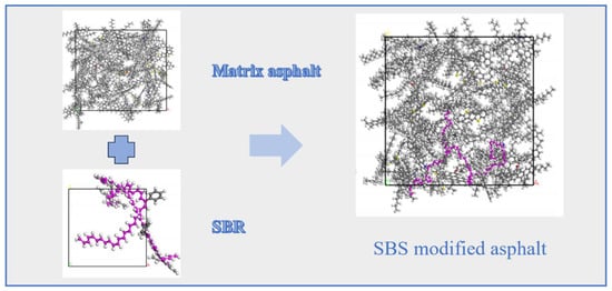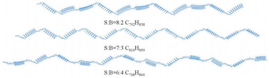 Commonly used polymer modifiers for asphalt include SBS, polyethylene, polypropylene, and ethylene-vinyl acetate copolymer (EVA), among which SBS-modified asphalt is the most widely applied [34]. Styrene–butadiene–styrene block copolymer belongs to thermoplastic elastomers and is the most commonly used high-viscosity modifying component in engineering applications [35,36]. During the mixing process, SBS and asphalt gradually form a microscopic cross-linked structure, significantly enhancing the pavement performance of the modified asphalt mixture [37]. The molecular weight of SBS is 105, and representative molecular segments are generally selected for model construction [38]. According to related studies [9,39], Fan et al. [38] constructed an SBS molecular model using MS 2020 software, mainly composed of six styrene units, three butadiene units, and six styrene units polymerized sequentially, as shown in Figure 8. SBS is a long-chain thermoplastic elastomer polymer modifier. Meanwhile, the block ratio is a key parameter during the modification process. Li, G. et al. [40] constructed three typical linear SBS molecules with different block ratios, as illustrated in Figure 9, where each SBS molecule contains six different concentrations ranging from 2% to 12% with 2% intervals. Of course, SBS can be categorized into linear SBS (L-SBS) and star-shaped SBS (S-SBS). Mouillet et al. [41] observed via microscopy that L-SBS appears as dispersed spherical particles in modified asphalt, whereas S-SBS forms irregular shapes.