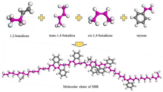 A large number of used tires are produced worldwide each year. The traditional disposal methods for these waste tires include incineration, landfilling, and storage, all of which undoubtedly pose environmental hazards [42,43,44]. According to the study by Liao et al. [45], the main component of tires is SBR, a random copolymer derived from the monomers, styrene and butadiene. Based on previous studies, Xie T. et al. [46] constructed an SBR polymer model, as shown in Figure 10. In their investigation into the fundamental mechanism underlying the compatibility between the SBR modifier and base asphalt, Jiao X. L. et al. [47] established crystalline unit models of asphalt and the modifier, as illustrated in Figure 11.