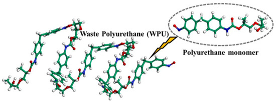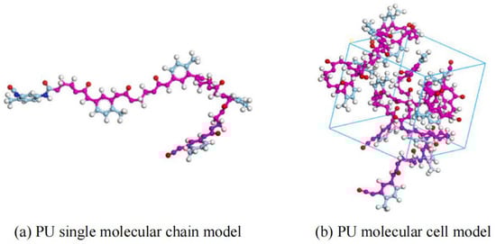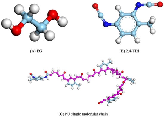 PU is a novel polymer modifier that contains the –NHCOO– structure in its main chain. Due to its good compatibility with asphalt, PU is commonly used as an asphalt modifier [48]. Considering the high molecular weight of PU and the need for accurate and reasonable simulation, Lu P. et al. [49] selected a single-chain PU model with a degree of polymerization of 4, in which the urethane segments are repeated up to 10 times. The single-chain PU model (a) and the complete PU molecular model (b) are shown in Figure 12. Lu P. et al. [50] further investigated the mechanical properties of PU, using polyethylene glycol (PEG) as the soft segment and 2,4-toluene diisocyanate (2,4-TDI) as the hard segment. The polymer model was constructed based on the monomers, ethylene glycol and 2,4-TDI, as illustrated in Figure 13. On the basis of PU modifiers, Zhang T. et al. [51] explored the effects of waste polyurethane (WPU) on the rheological properties and compatibility of SBS-modified asphalt. The molecular models of WPU and WPU/SBS-modified asphalt were established, as shown in Figure 14.