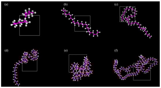 PE molecular model with different degrees of polymerization (a) 6 (b) 12 (c) 24 (d) 30 (e) 42 (f) 78 [53].